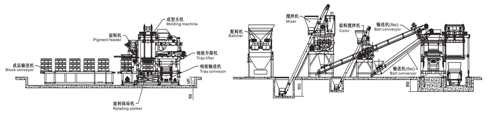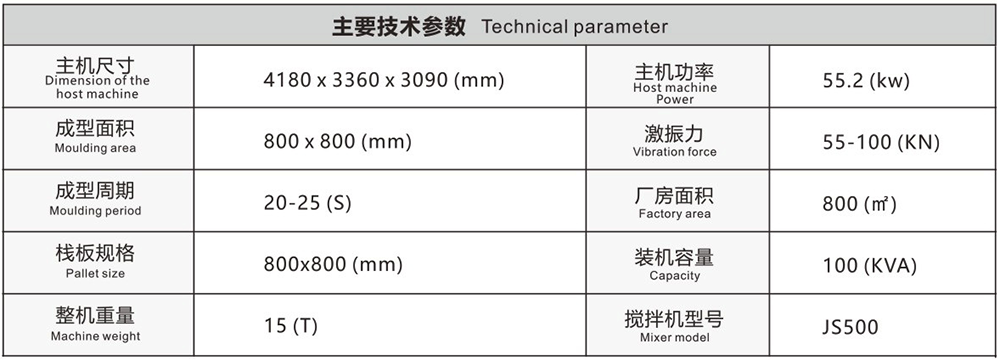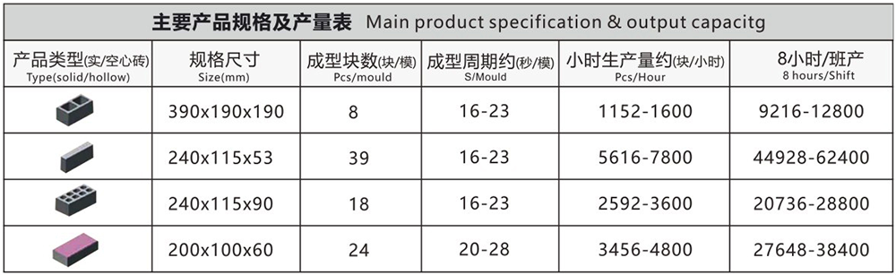 用途:生产各种外墙砌块、内墙砌块、花墙砌块、楼板块、护堤块、连锁块、路缘石等砌块。增加面料装置可生产彩色路面砖。